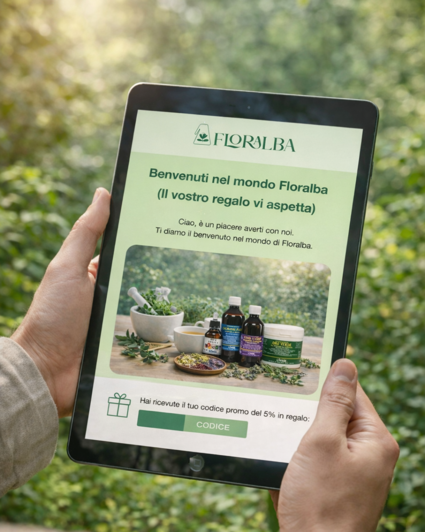 Appena ti iscrivi alla newsletter, ricevi un codice sconto del 5% da applicare immediatamente sul tuo primo ordine. Ma non finisce qui: entrando nella community Floralba, riceverai sconti periodici, pensati per premiare chi sceglie un percorso di salute naturale.